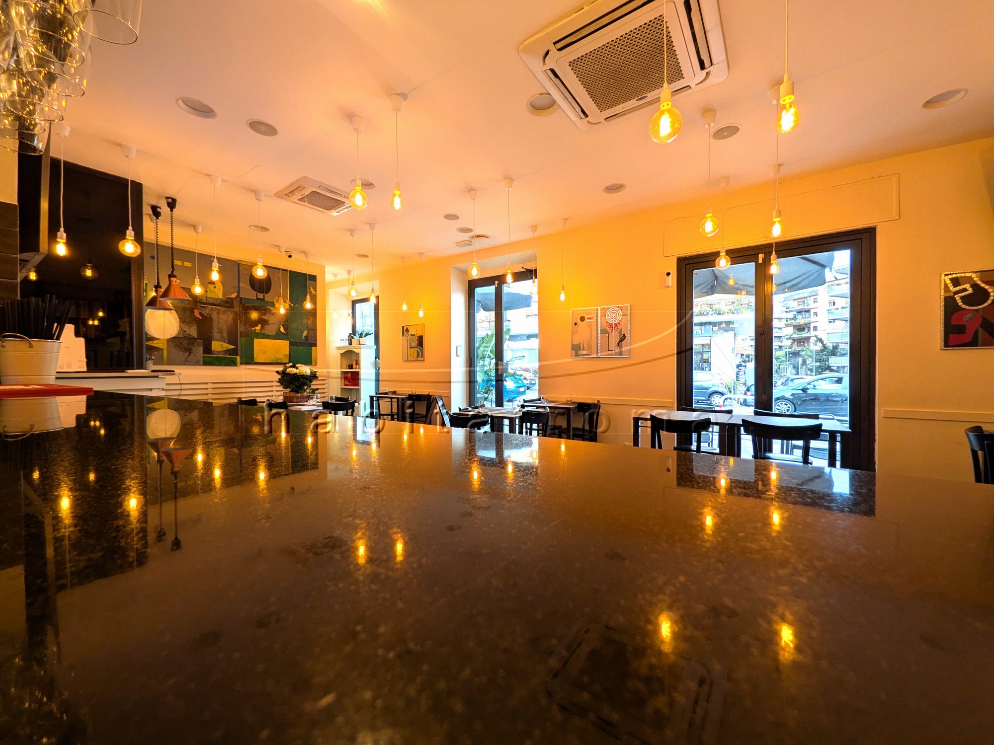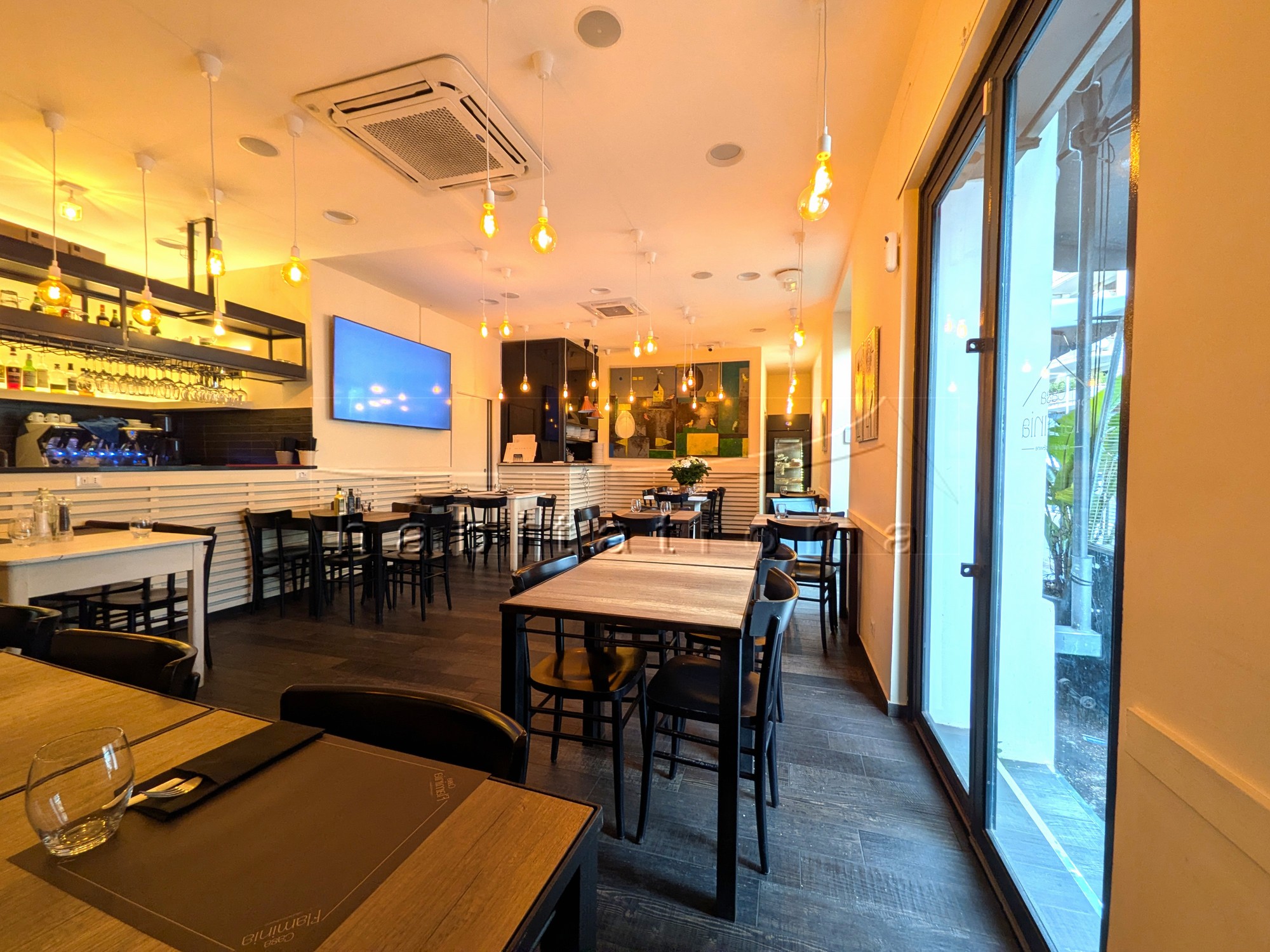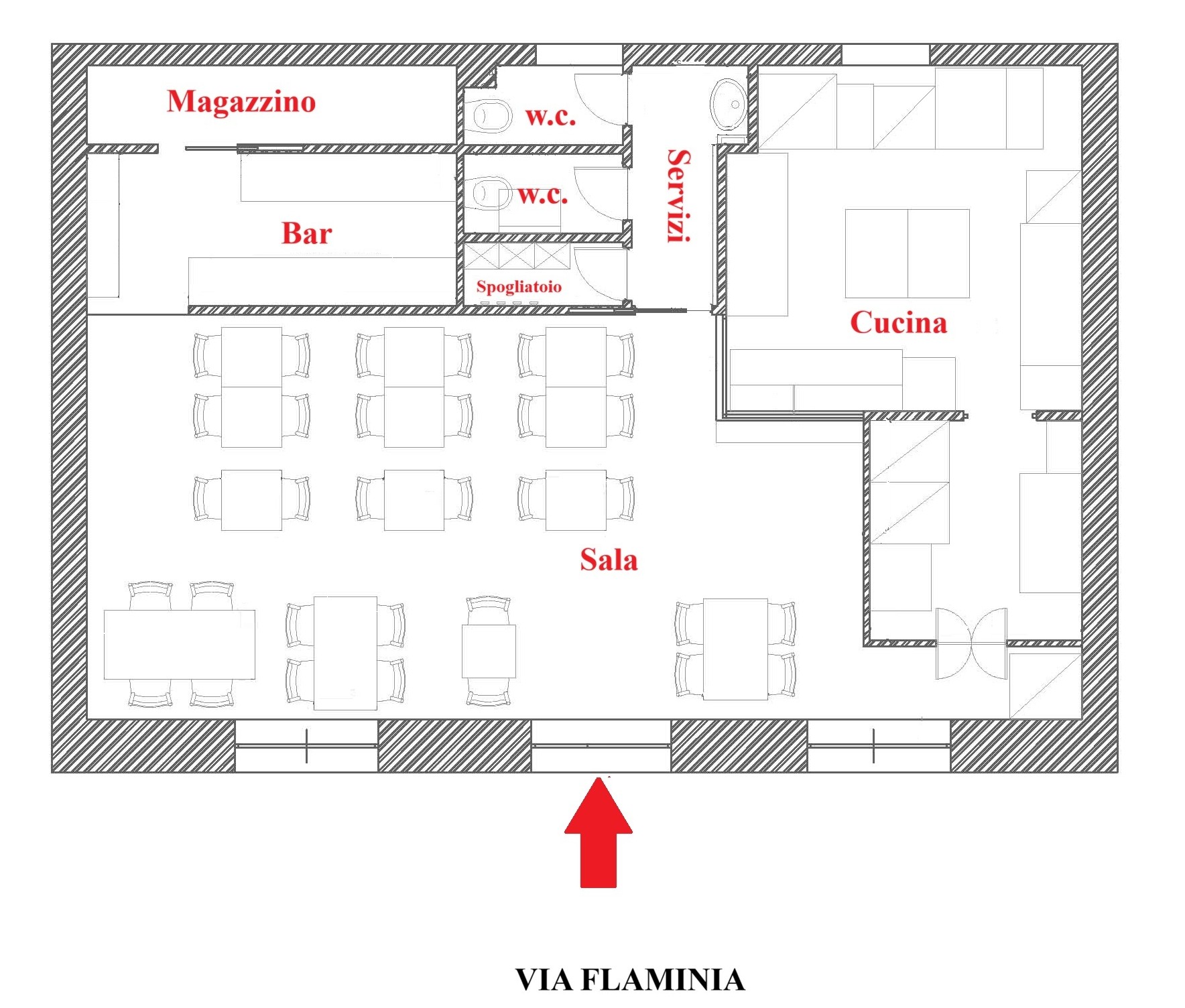 Il locale, ristrutturato e finemente arredato, si sviluppa su un unico piano fronte strada di 81mq e dispone di tre porte di accesso, una sala somministrazione di 49mq, bancone bar, ampia cucina completamente attrezzata, magazzino/deposito, servizi doppi e spogliatoio per dipendenti.