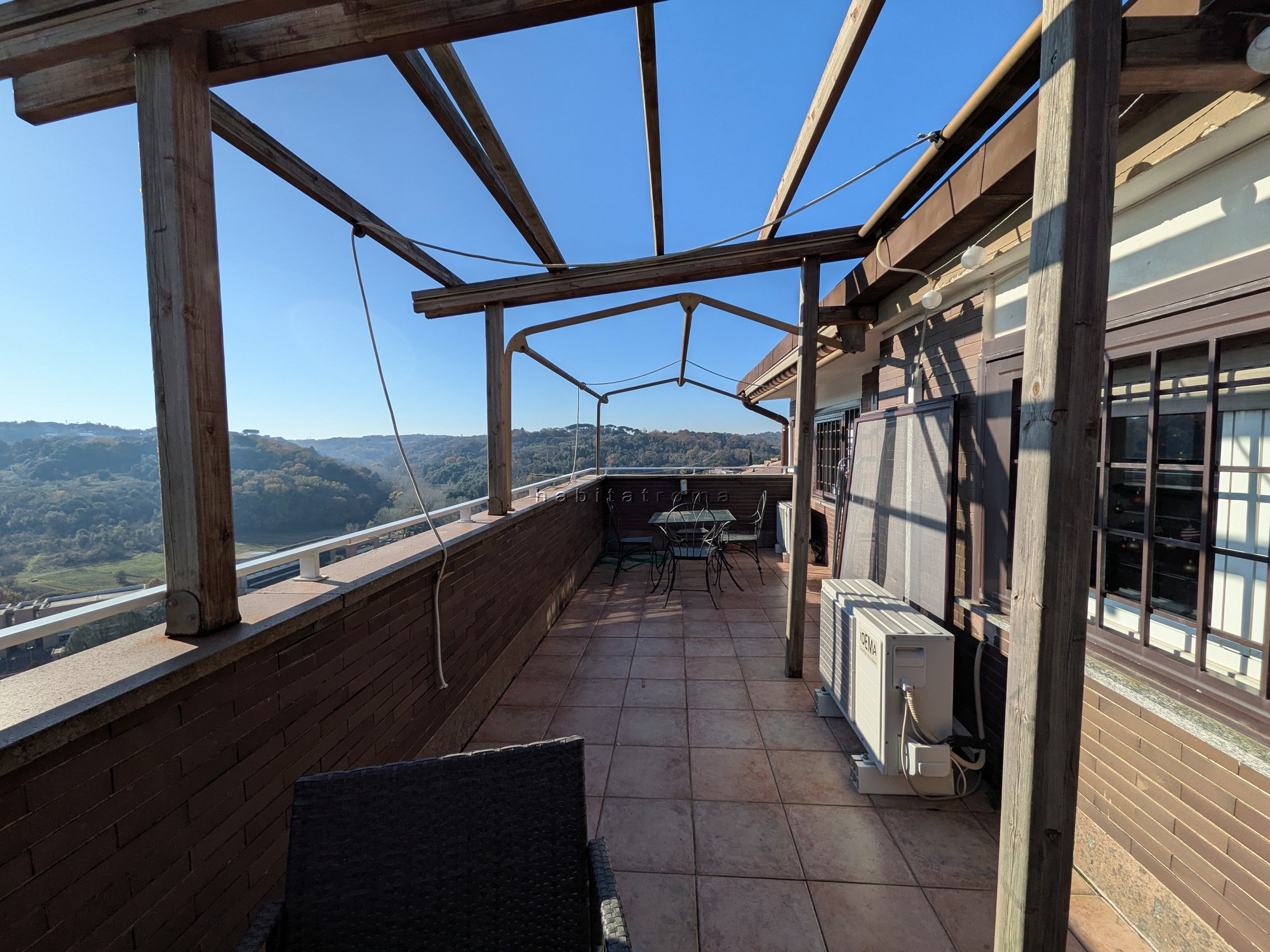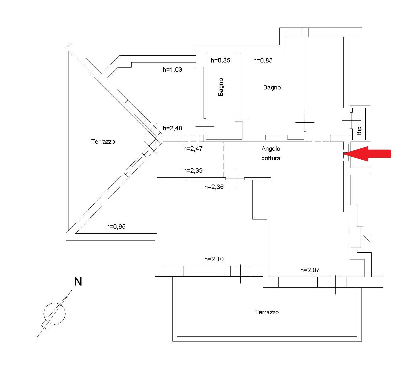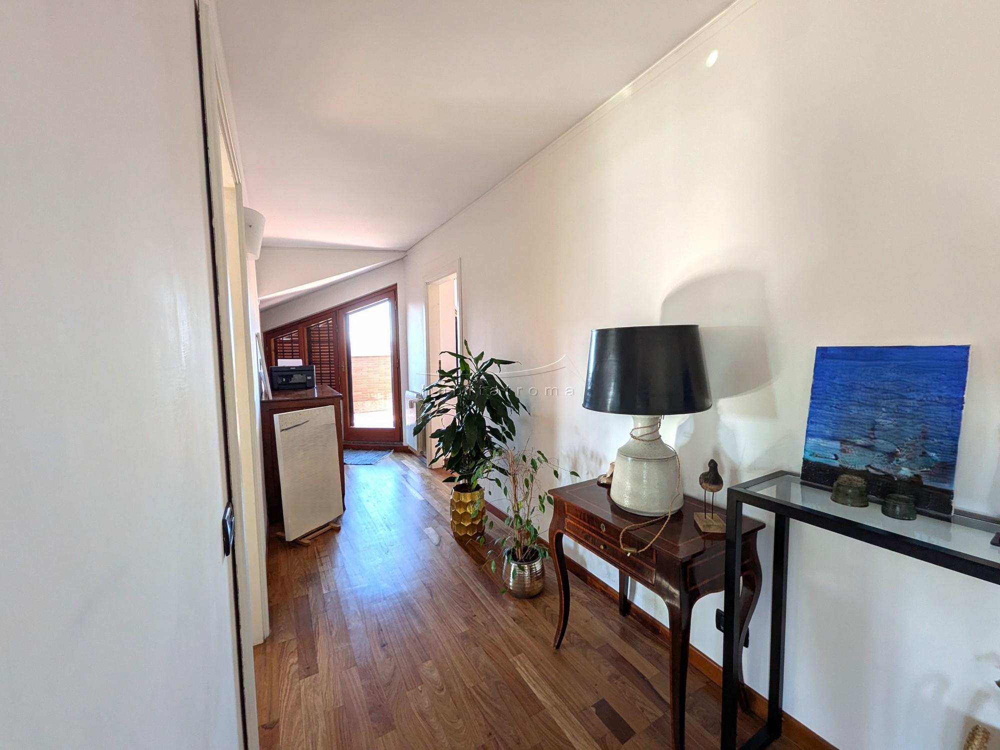 L’appartamento è posto al sesto ed ultimo piano (con ascensore che arriva al quinto piano), ha altezze variabili; è composto da un soggiorno con camino e con accesso alla terrazza principale, cucinino, due camere da letto, doppi servizi, camera uso ripostiglio, seconda terrazza.
