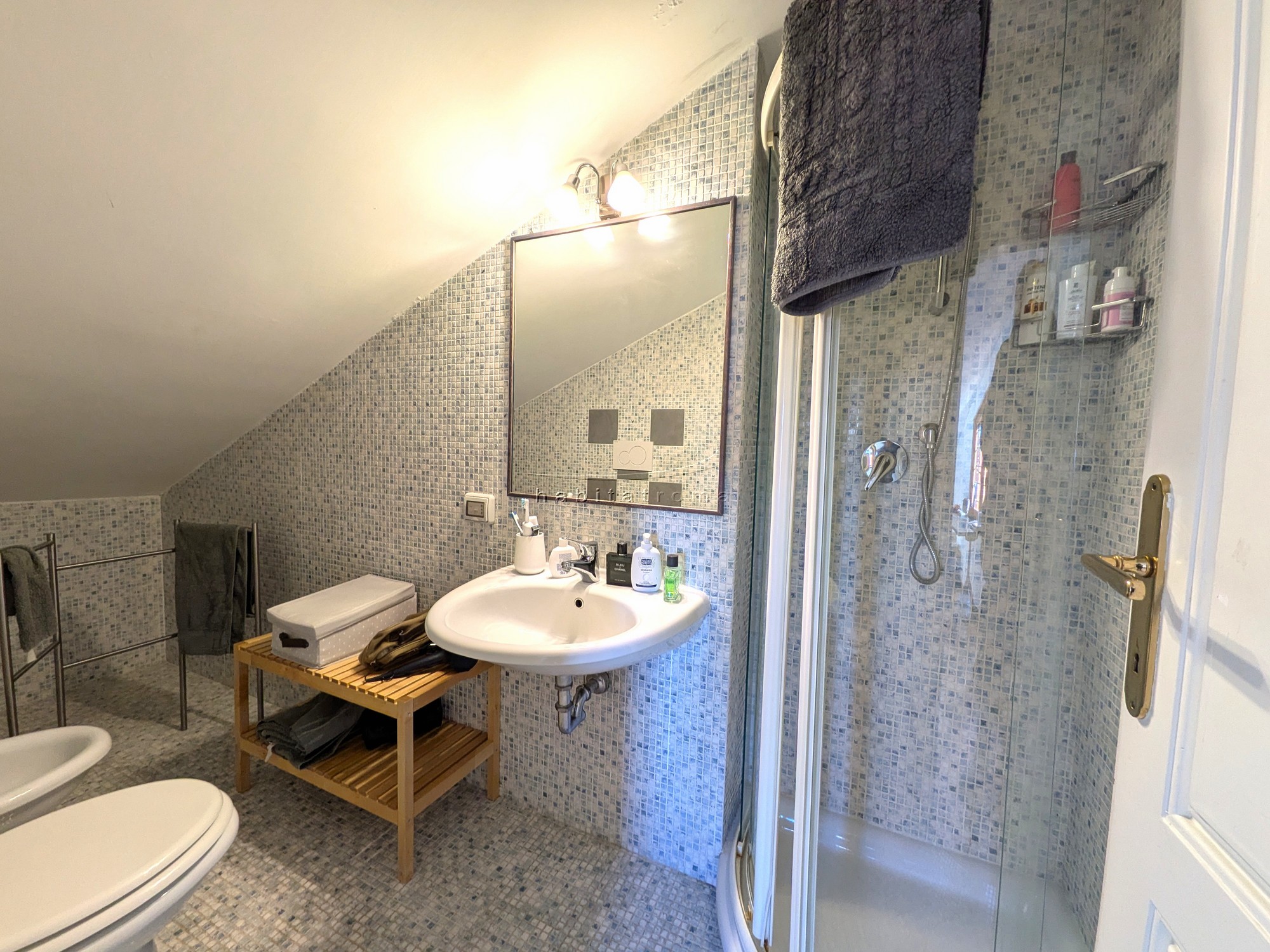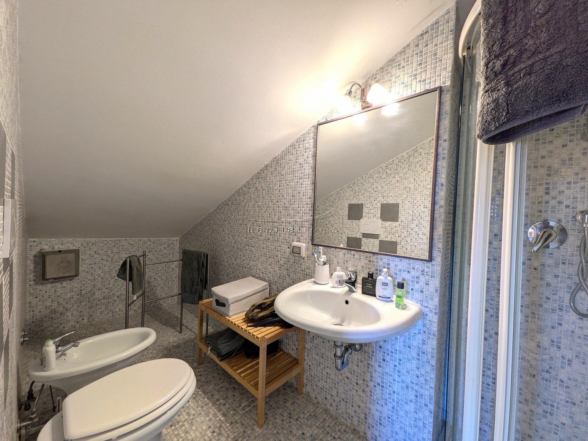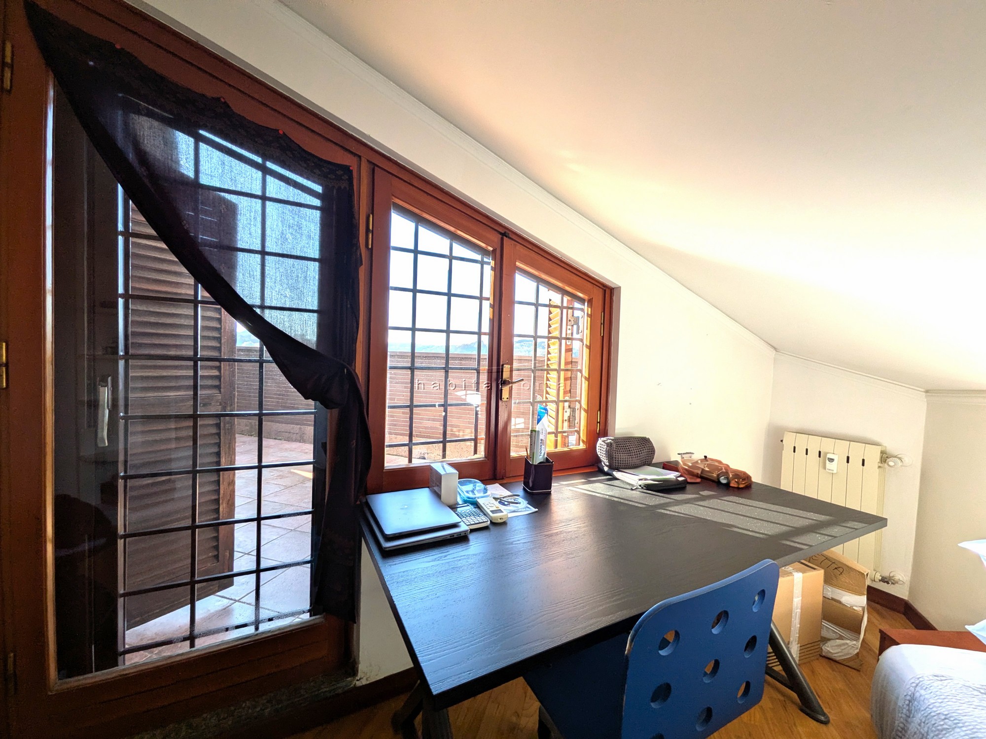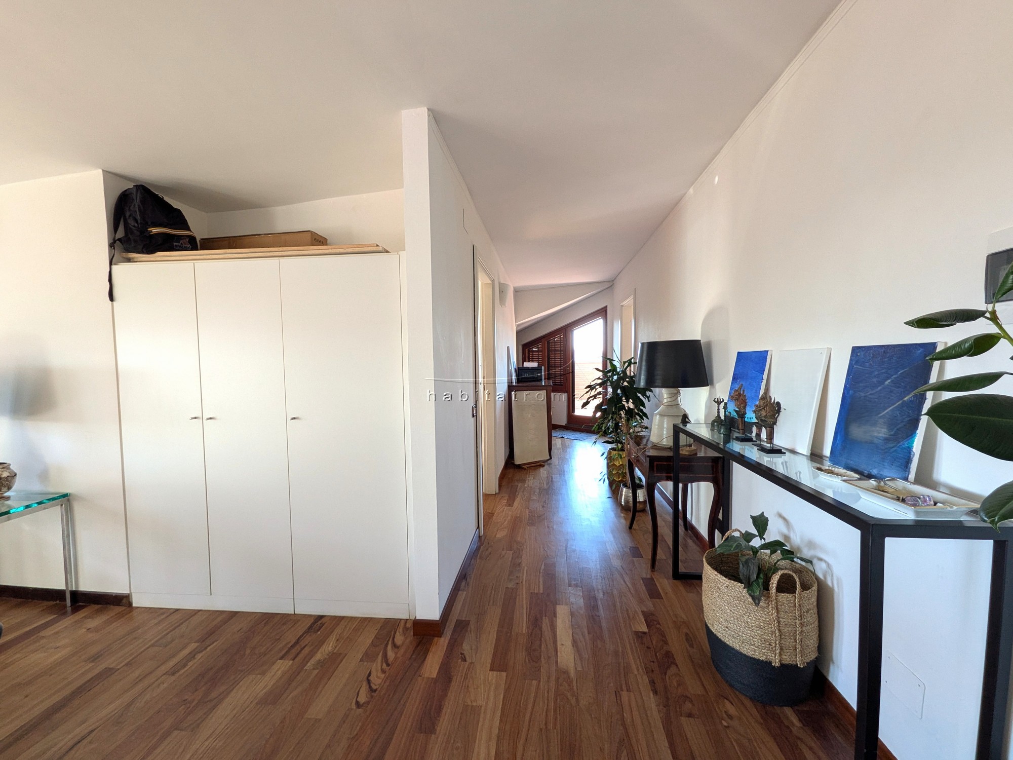 L’appartamento è posto al sesto ed ultimo piano (con ascensore che arriva al quinto piano), ha altezze variabili; è composto da un soggiorno con camino e con accesso alla terrazza principale, cucinino, due camere da letto, doppi servizi, camera uso ripostiglio, seconda terrazza.