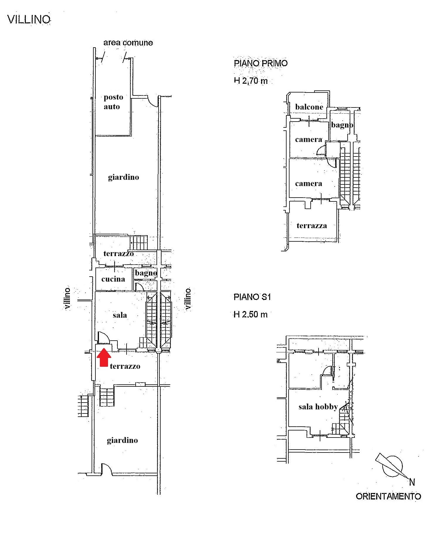 • Piano terra: soggiorno, cucina, antibagno e bagno, due terrazzi e due giardini uno dei quali con entrata carrabile